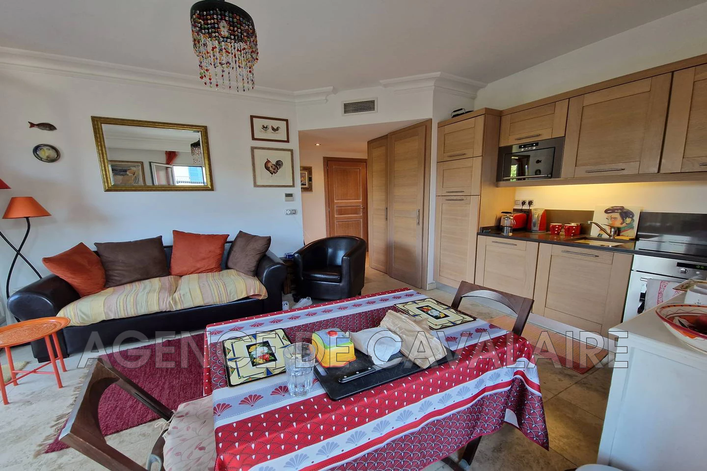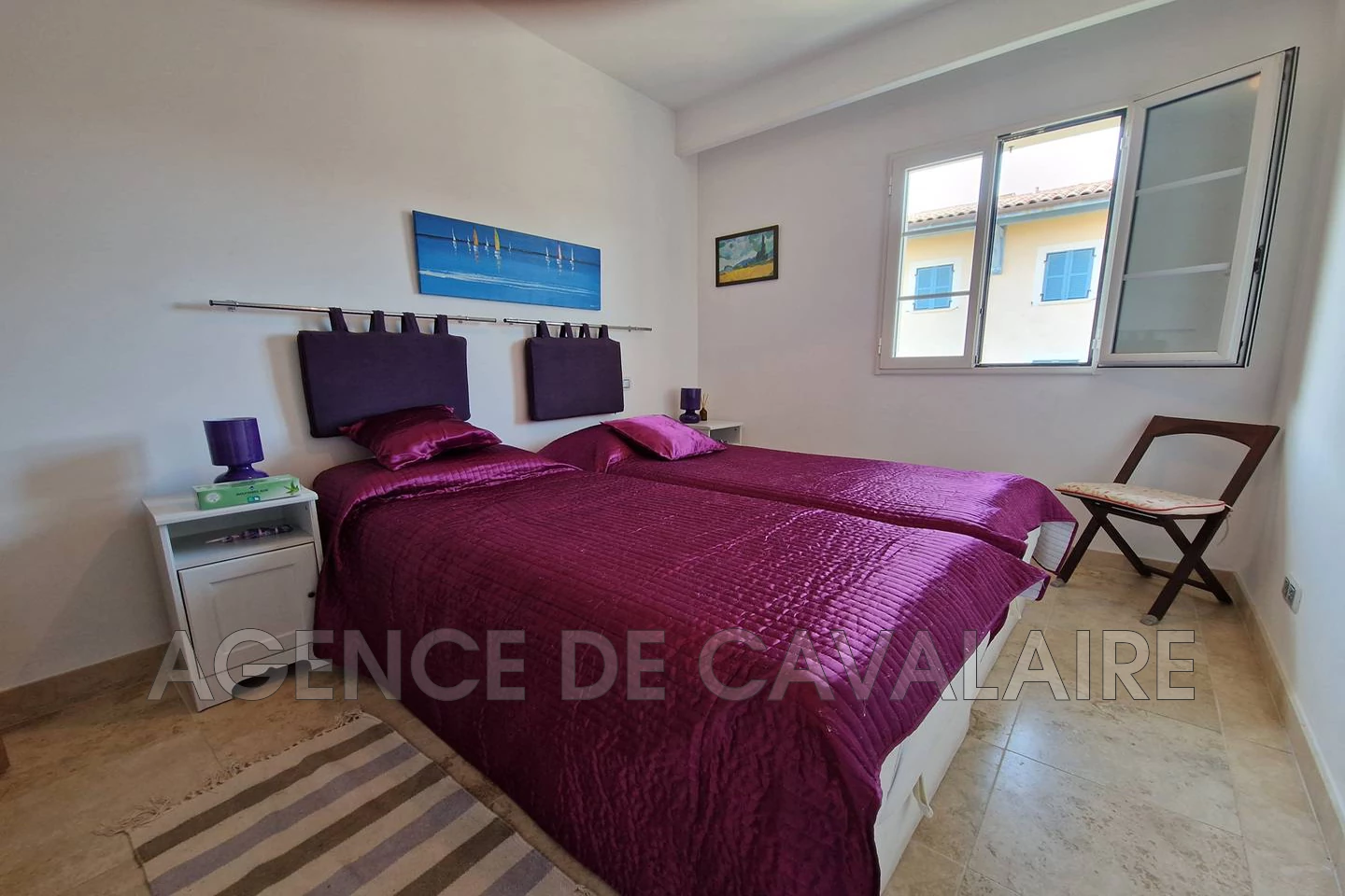 À 200 mètres du centre du village, dans une résidence sécurisée au deuxième étage sans ascenseur appartement de 55m². Entièrement climatisé, une cuisine ouverte sur le séjour, une belle terrasse de 27m². Une première chambre : 2 lits simples. Une deuxième chambre : lit double. Une salle de bain. WC indépendant. Une piscine collective dans la résidence.